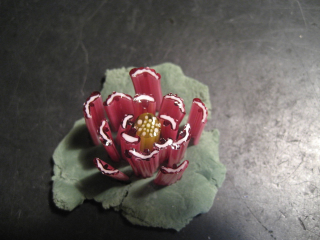 の作品を見て、そういえば私が教室で習ってた時、その教室で外部の講師を年に1回招いて教えてもらうっていうのをやっていて、私が入った年は、竹内先生が教えに来てくれて、私はその時、先生以外の人のデモを見るのもワークショップを受けるのも初めてだったけど、「ボタン」と「ひまわり」を教えてもらったけど、全部ソーダガラスを使って徐冷して使えば割れません。って言われたけど、電気炉も持ってなかったし、ソーダガラスもほとんど使ったことないし、しかも初心者なのにかなり難しそうでメモはとったけど全く作ってなかった!と気づきソーダはないので鉛で代用して作ってみることに