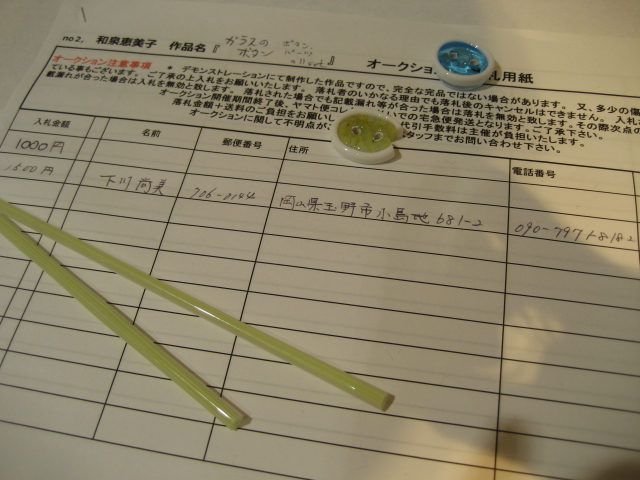昨日のデモで作られてた作品がオークションに出ていました。今年は、コラボのデモが多かったので、デモは見なかったけど、線のとんぼ玉や、ボタンを作られていて、見たかったなぁとちょっと後悔。。